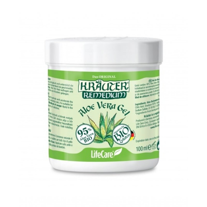 Gelul de Aloe Vera BIO, Life Care® contine 95% Aloe Vera BIO. Aceasta ajuta la hidratarea si ingrijirea pielii. Intensifica procesul natural de regenerare a pielii. Poate fi folosit si in cazul arsurilor solare.