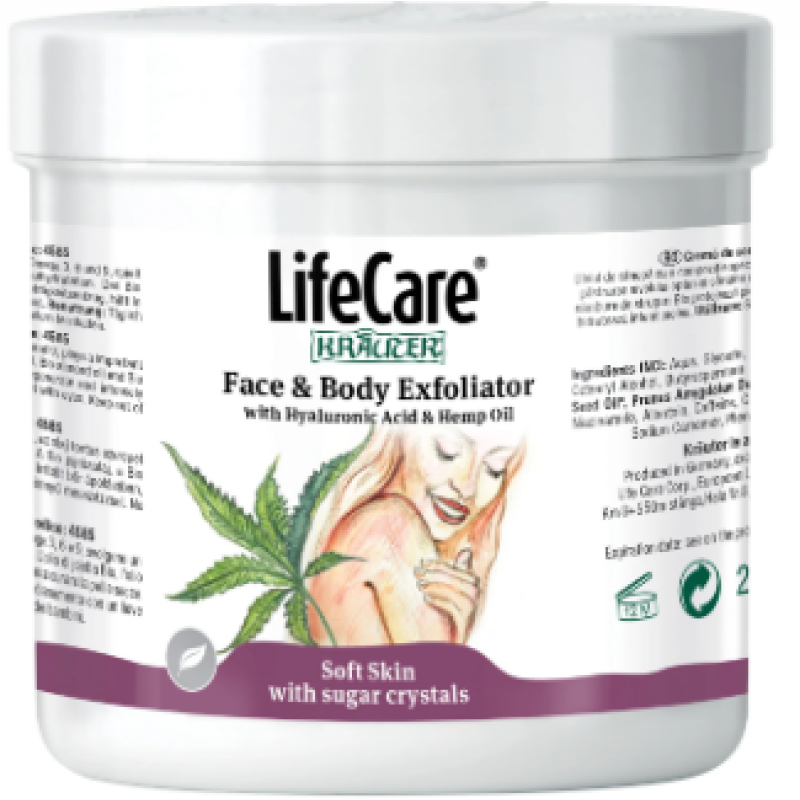 • Exfoliant pentru fata si corp cu acid hialuronic si ulei de canepa Life Care® - contine cristale de zahar invelite cu acid hialuronic, ulei de canepa, ulei de migdale si vitamina E care indeparteaza celulele epiteliale moarte si hidrateaza intens pielea, lasand-o fina la atingere.