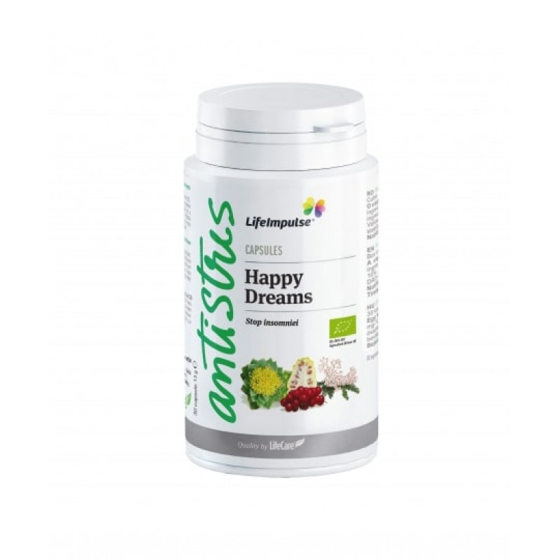• Life Impulse HappyDreams ECO este un supliment alimentar cu extracte BIO din fructe si plante de Schisandra, Noni, Rhodiola si Valeriana. Acesta ofera un somn linistitor, fara intreruperi, intreaga noapte si poate inlatura insomnia. In plus, suplimentul alimentar Life Impulse HappyDreams reduce efectele negative ale stresului fizic si induce o stare de relaxare in creier intreaga zi. Acest produs este vegan, nu contine ingrediente de origine animala si nu a fost testat pe animale inainte de a fi comercializat. Este recomandata o capsula pe zi de Life Impulse HappyDreams, inainte de culcare pentru rezultate vizibile. De asemenea, acest supliment alimentar nu este indicat copiilor sub 16 ani, femeilor gravide sau care alapteaza, fara un consult de specialitate inainte. Dieta normala nu poate fi inlocuita cu folosirea acestui supliment alimentar.
